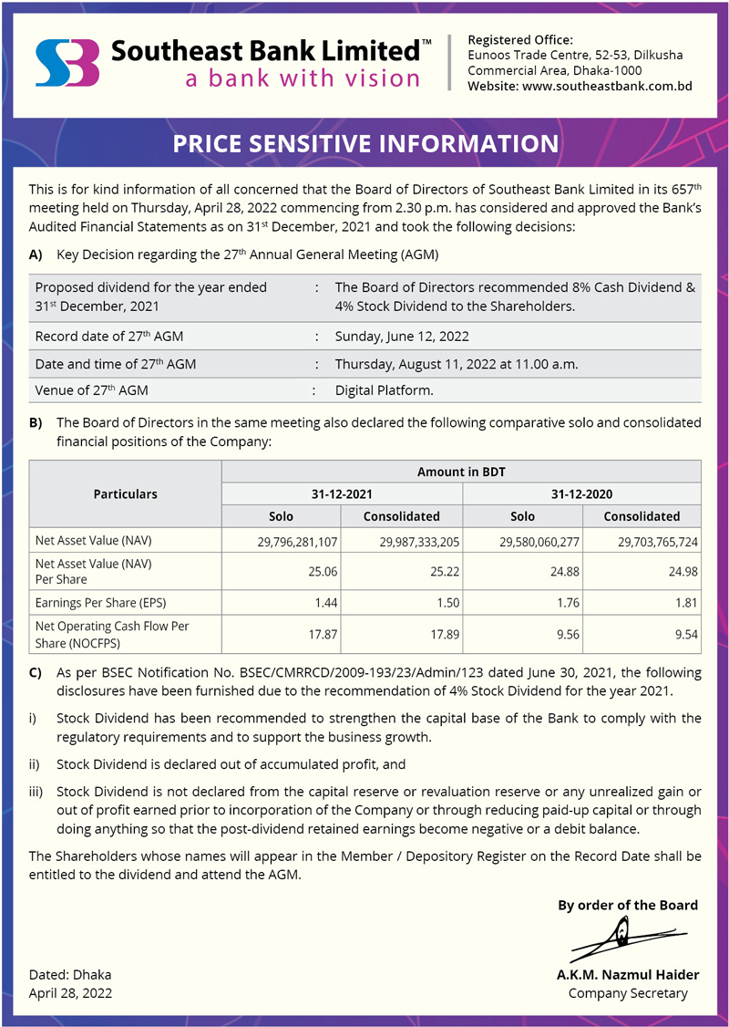 Price Sensitive Information of Southeast Bank Limited