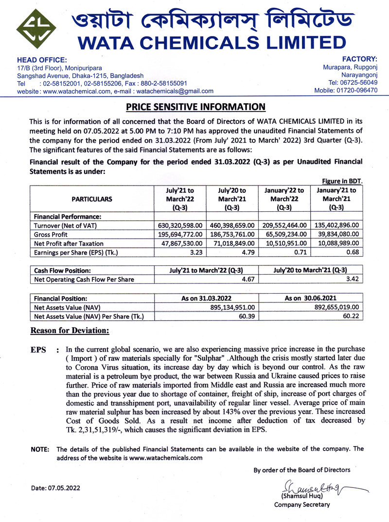 Price Sensitive Information of Wata Chemicals Limited
