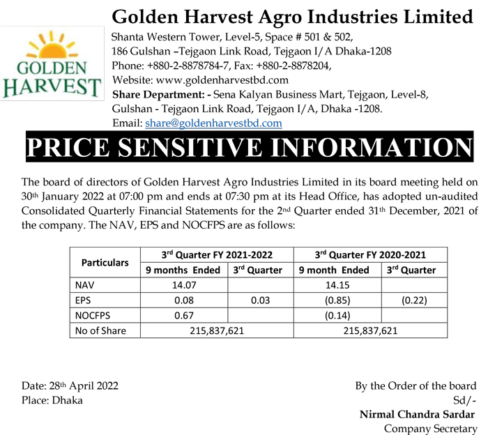 Price Sensitive Information of Golden Harvest Agro Industries Ltd.