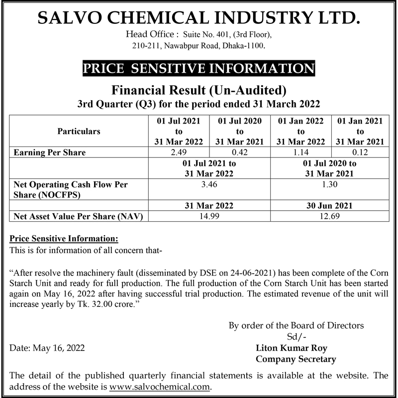 Price Sensitive Information of Salvo Chemical Industry Ltd.