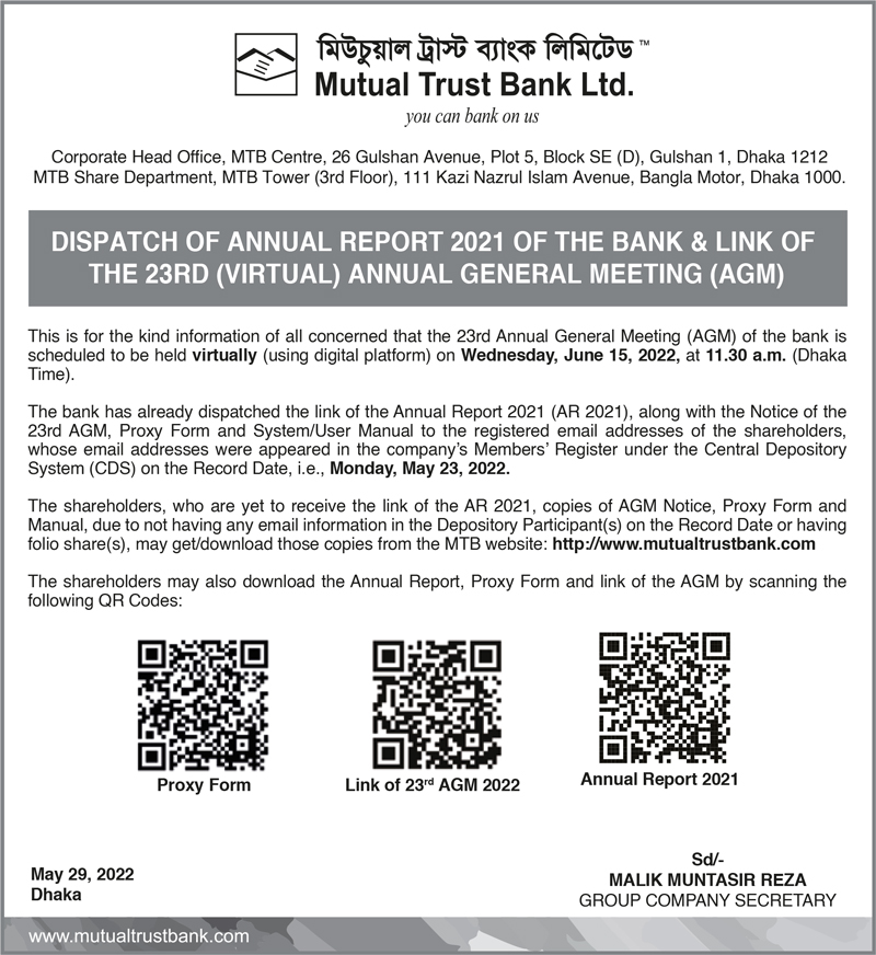 Dispacth of Annual Report and the 23rd AGM of Mutual Trust Bank Limited