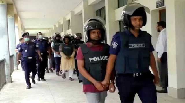 মামলার ৭ আসামির মধ্যে ৫ আসামি রাজীব গান্ধী, রিয়াজুল ইসলাম ওরফে মেহেদী, ফিরোজ হাসান ওরফে মোখলেছ, মাহাবুব হাসান মিলন ও আবু নাছির ওরফে রুবেলকে কঠোর নিরাপত্তার মধ্যদিয়ে আদালতে হাজির করা হয়।