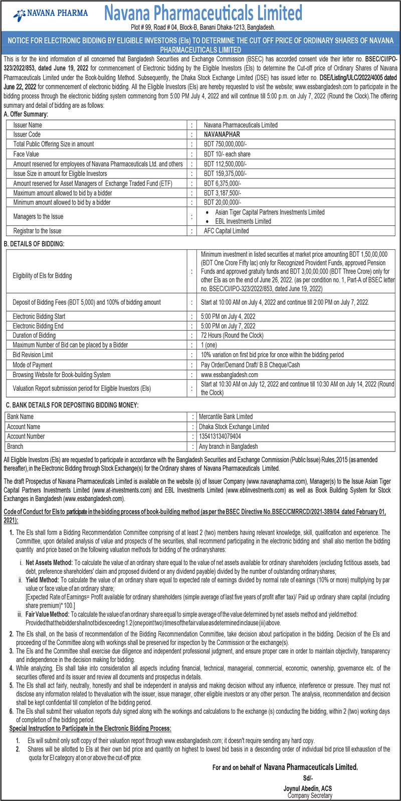 Notice for Electronic Bidding by Eligible Investors (Eis) To Determine The Cut Off Price of Ordinary Shares of Navana Pharmaceuticals Limited