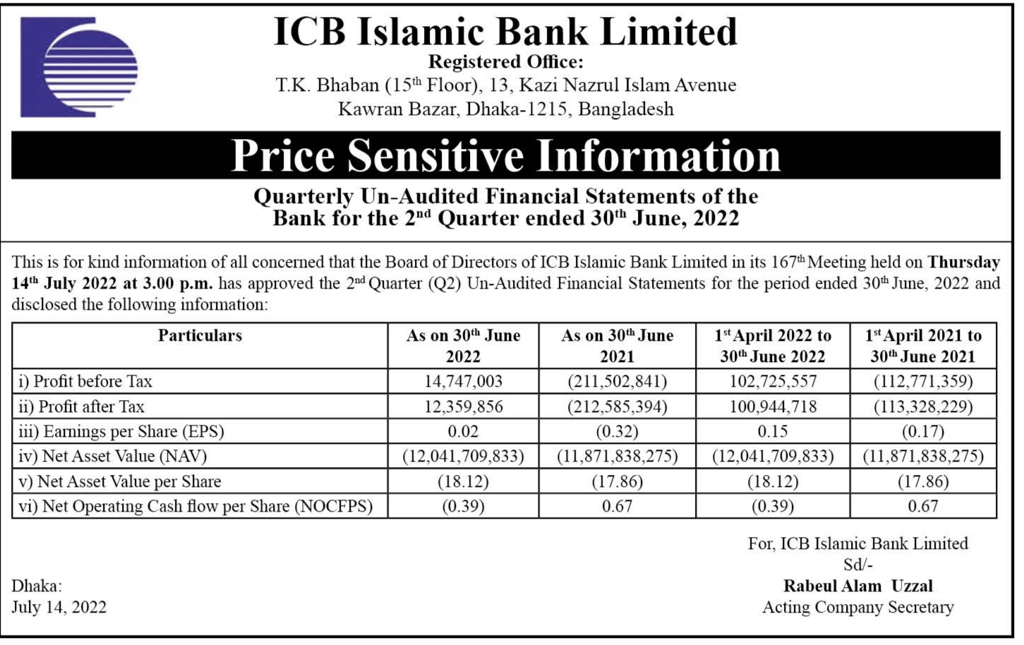 Price Sensitive Information of ICB Islami Bankn Ltd.