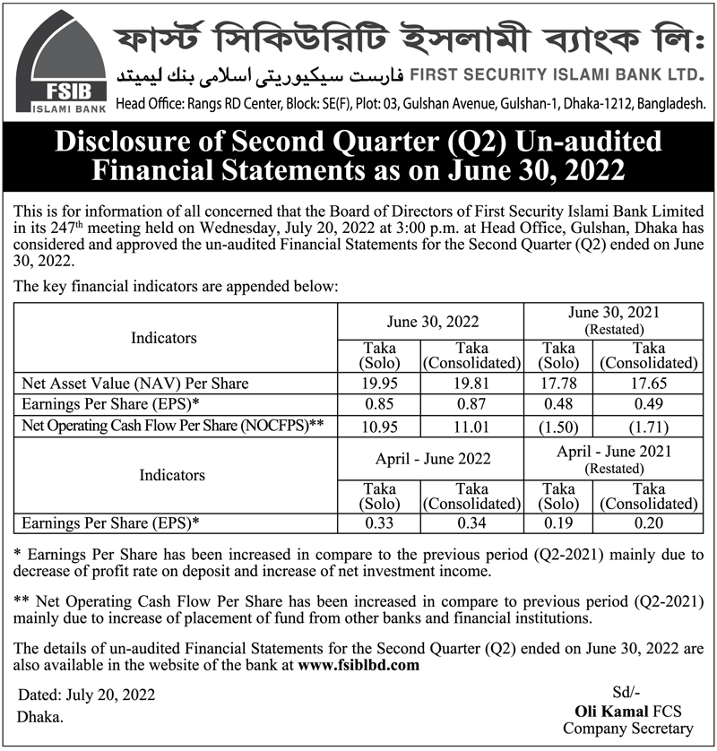 Q2 (Un-audited) Financial Statements of First Security Islami Bank Limited