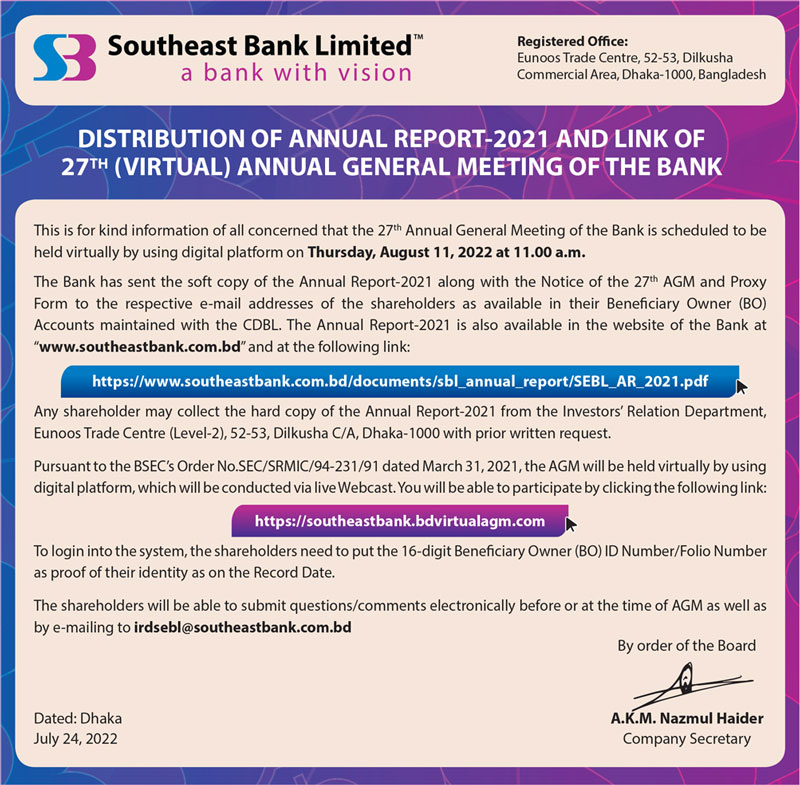 Distribution of Annual Report and Link of 27th AGM of Southeast Bank Limited