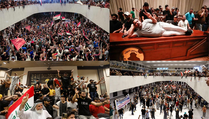 ইরাকের রাজধানী বাগদাদের গ্রিন জোনের নিরাপত্তা বলয় ভেদ করে পার্লামেন্ট ভবনে ঢুকে পড়েছে শত শত বিক্ষোভকারী। বিক্ষোভকারীরা ধর্মগুরু মুক্তাদা আল-সদরের সমর্থক। প্রতিদ্বন্দ্বী প্রার্থীকে প্রধানমন্ত্রী পদে মনোনয়ন দেওয়ার জেরে তারা বিক্ষোভ করেছে।