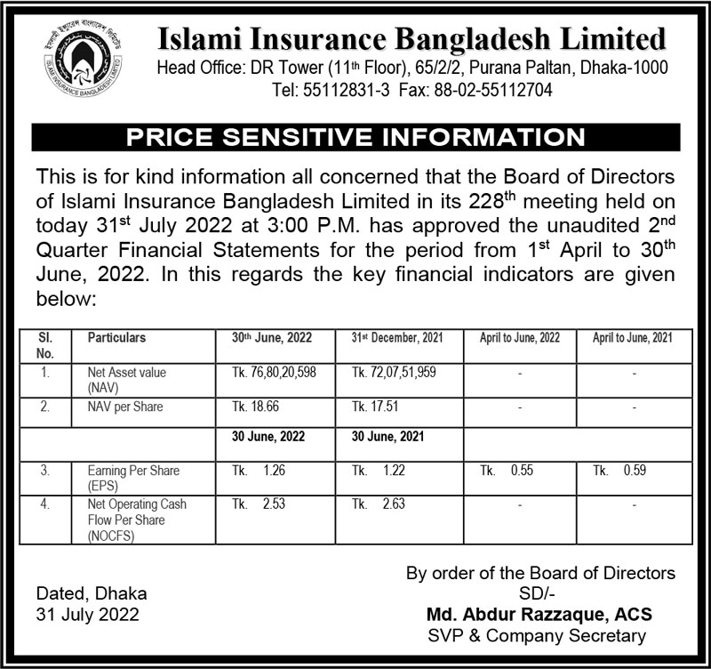 Price Sensitive Information of Islami Insurance Bangladesh Limited