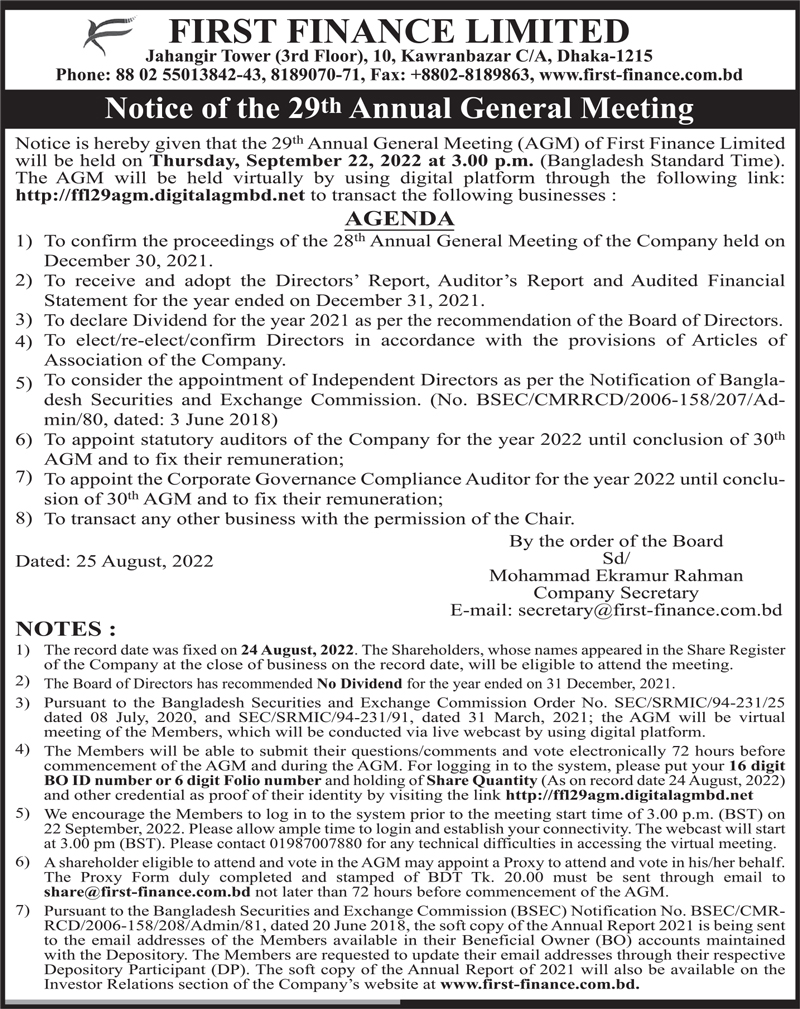 Notice of the 29th AGM First Finanice Limited