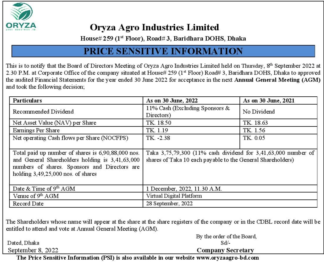 Price Sensitive Information of Oryza Agro Industries Limited