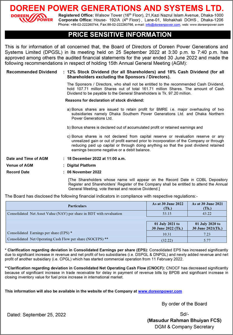Price Sensitive Information of Doreen Power Generations and Systems Limited