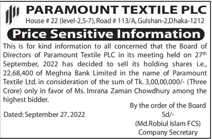 Price Sensitive Information of Paramount Textile PLC