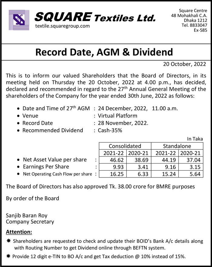 Record Date, AGM & Dividend of Square Textile Ltd.