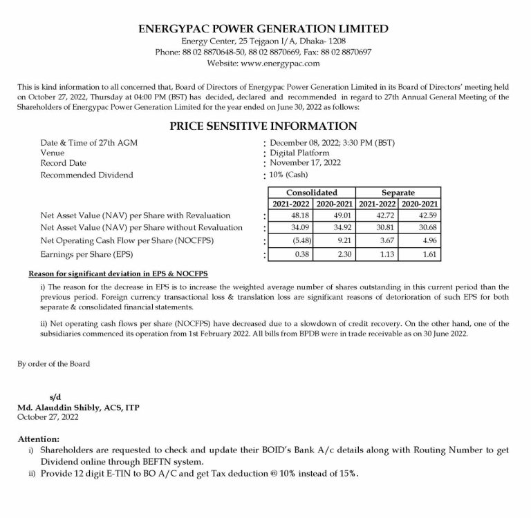 Price Sensitive Information of Energypac Power Generation Limited