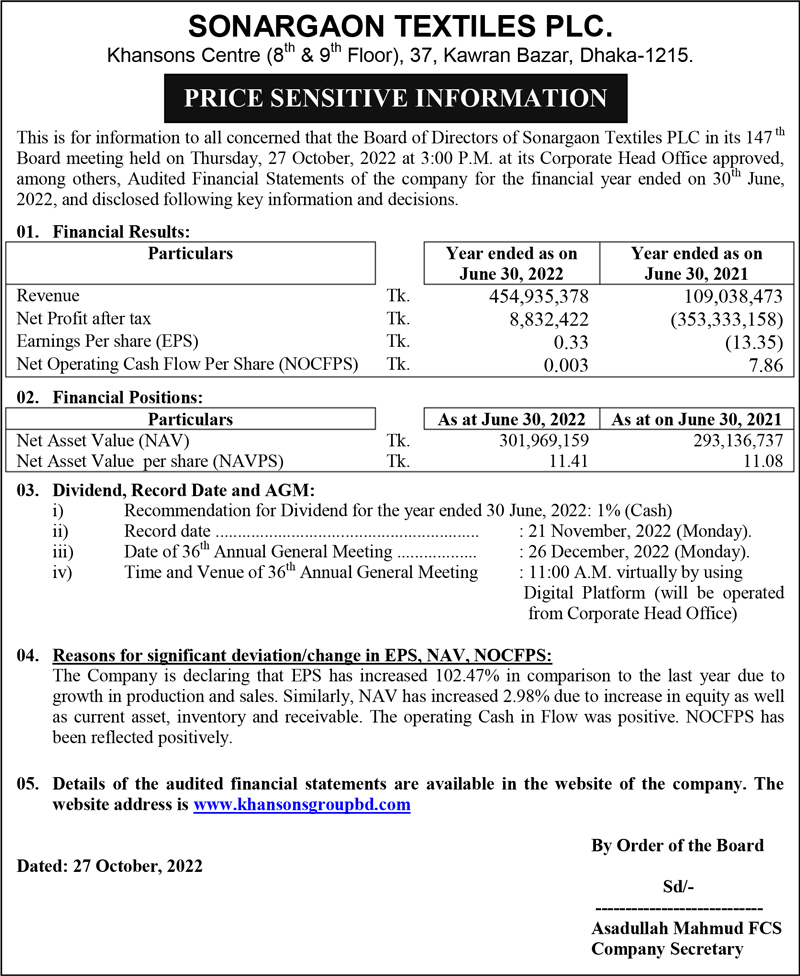 Price Sensitive Information of Sonargaon Textile PLC.