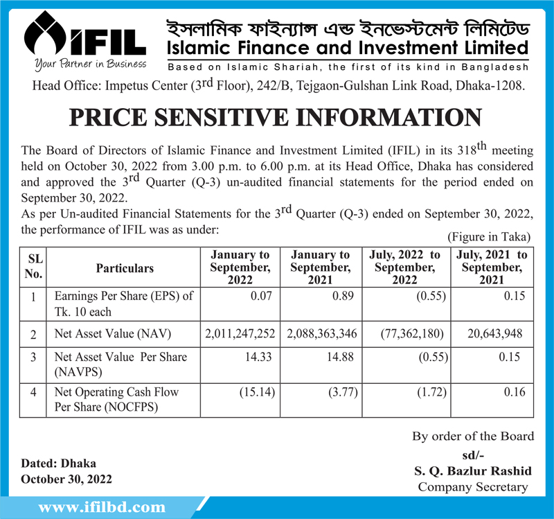 Price Sensitive Information of Islami Finance and Investment Limited