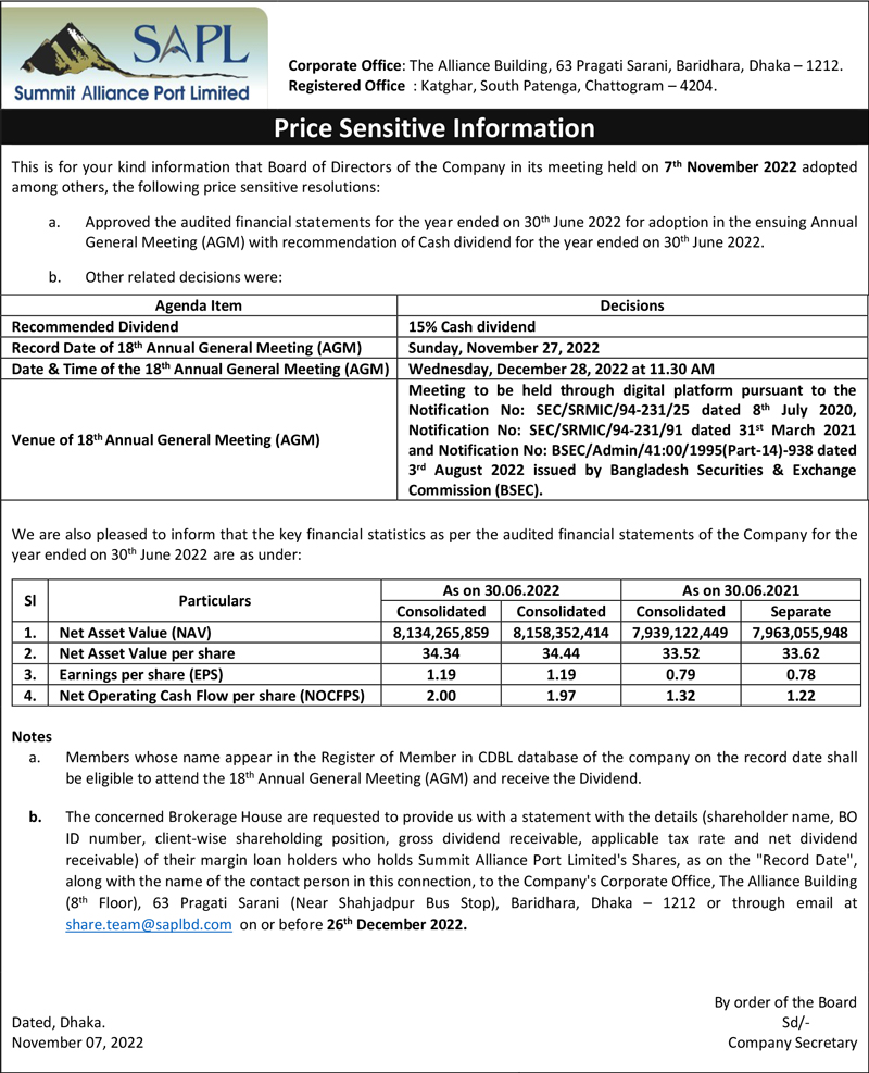 Price Sensitive Information of Summit Alliance Port Limited