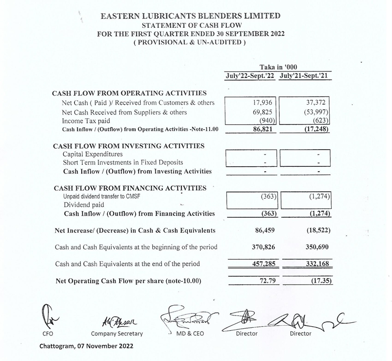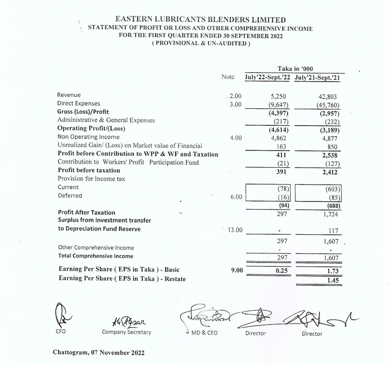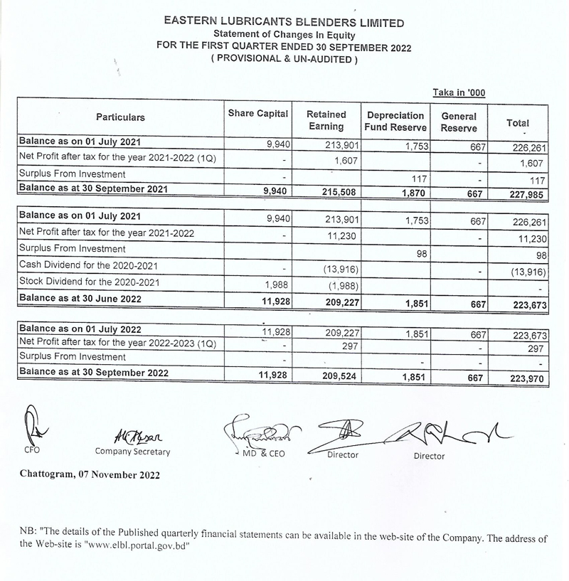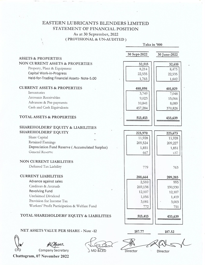 Statements of Financial Position of Eastern Lubricants Blenders Limited
