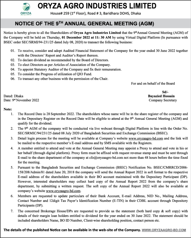 Notice of the 9th AGM of Oryza Agro Industries Limited
