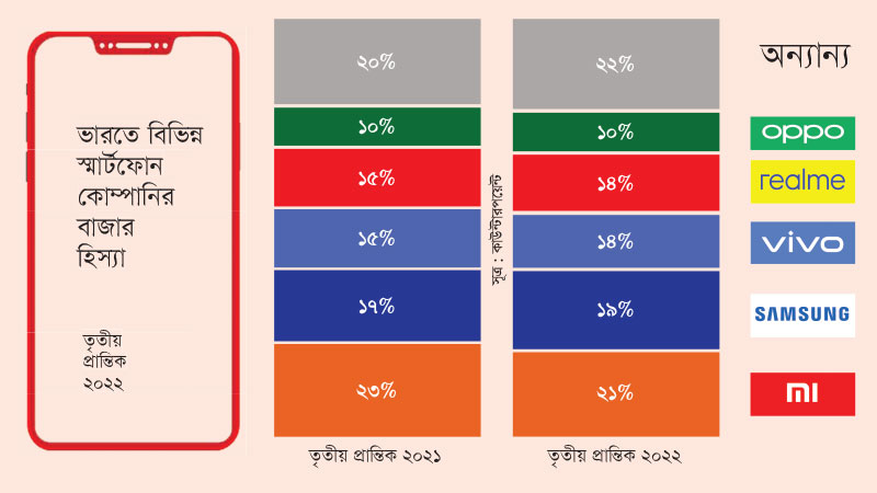 চলতি বছরের তৃতীয় প্রান্তিকে ভারতে স্মার্টফোন বিক্রি হয়েছে সাড়ে চার কোটি ইউনিট, গত বছরের একই প্রান্তিকের তুলনায় যা ১১ শতাংশ কমেছে। কাউন্টারপয়েন্ট রিসার্চের সাম্প্রতিক এক প্রতিবেদনে দেখা গিয়েছে, ২১ শতাংশ হিস্যা নিয়ে ভারতের বাজারে শীর্ষ স্মার্টফোন ব্র্যান্ড ছিল শাওমি।