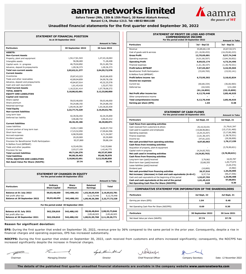 Un-audited Q1 Financial Statements of aamra networks limited