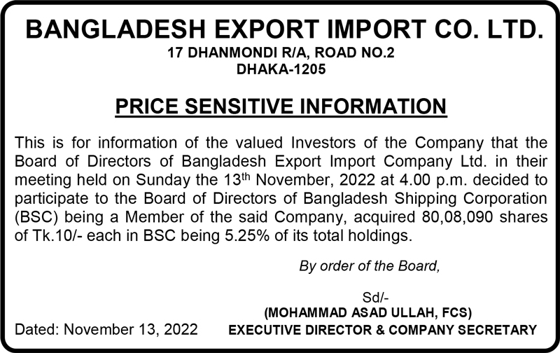 Price Sensitive Information of Bangladesh Export Import Co. Ltd.