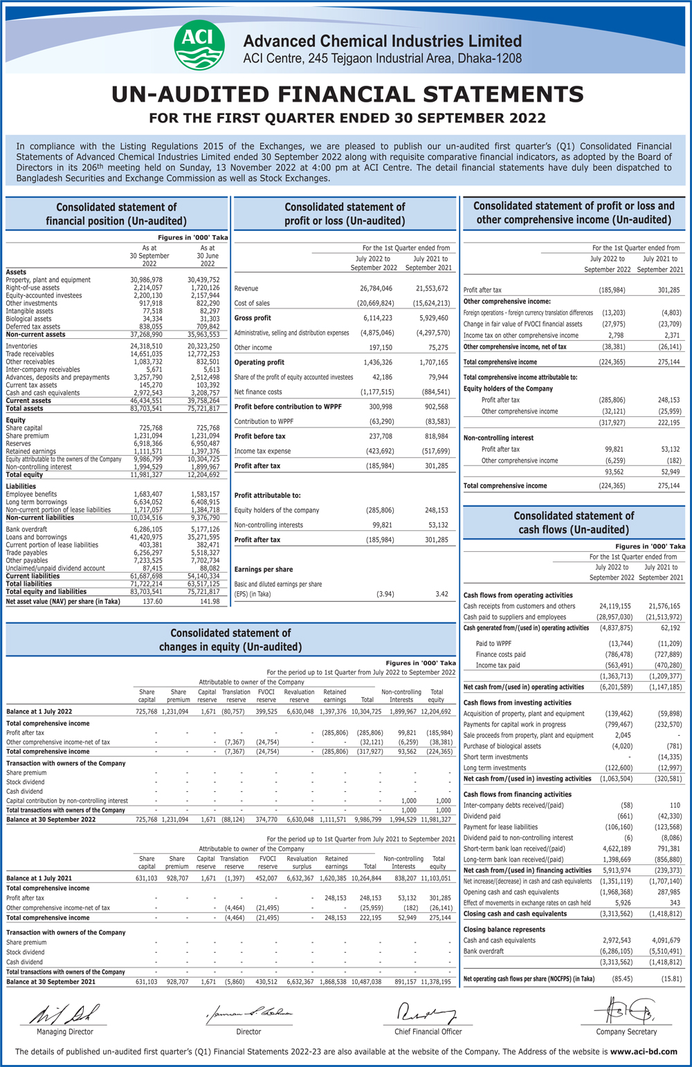 Un-audited Q1 Financial Statements of ACI Limited
