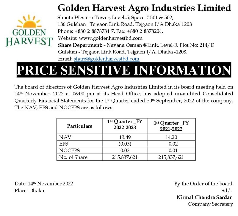 Price Sensitive Information of Golden Harvest Agro Industries Limited