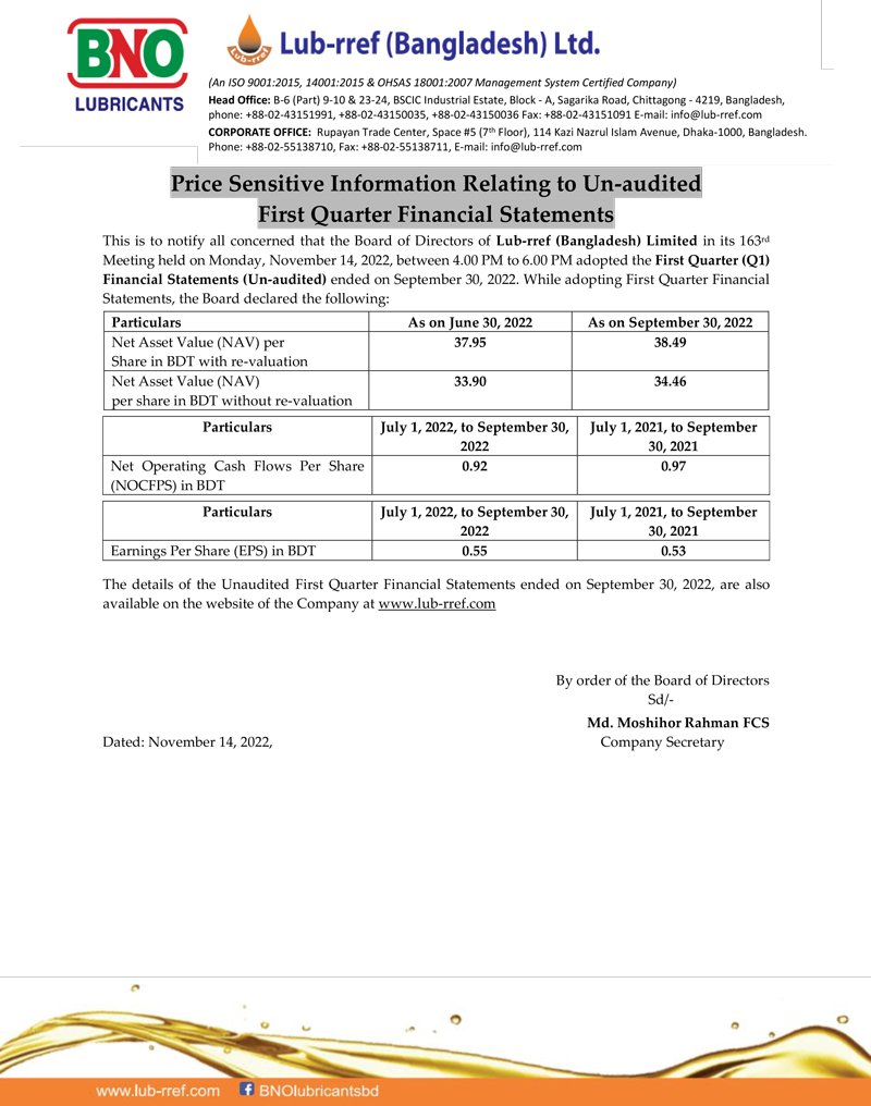 Price Sensitive Infrormation of Lub-rref (Bangladesh) Ltd.