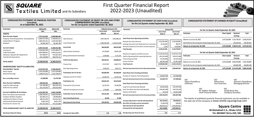 Q1 Financial Statements (Un-audited) of Square Textiles Ltd.