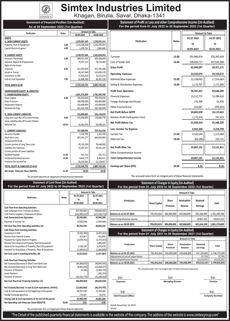 Statements of Financial Position (Un-audited) of Simtex Industries Limited