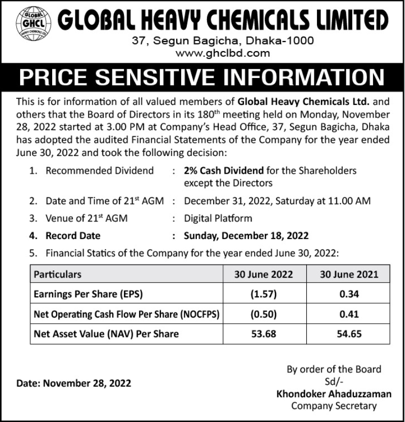 Price Sensitive Information of Global Heavy Chemicals Limited