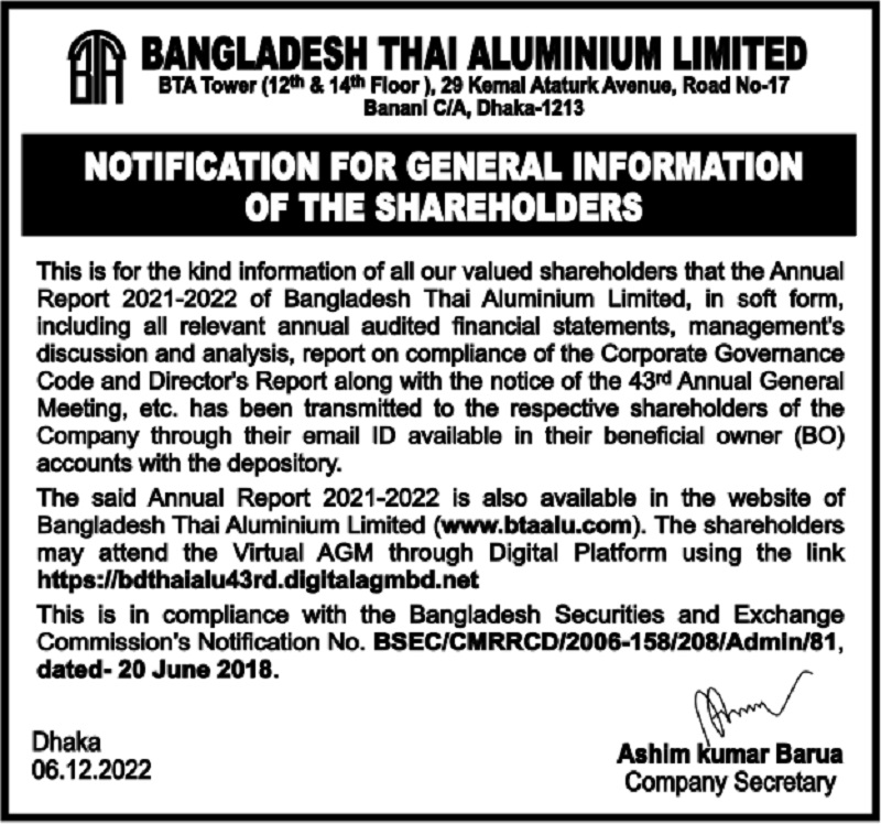 Notification for General Information of the Shareholders of Bangladesh Thai Aluminum Limited