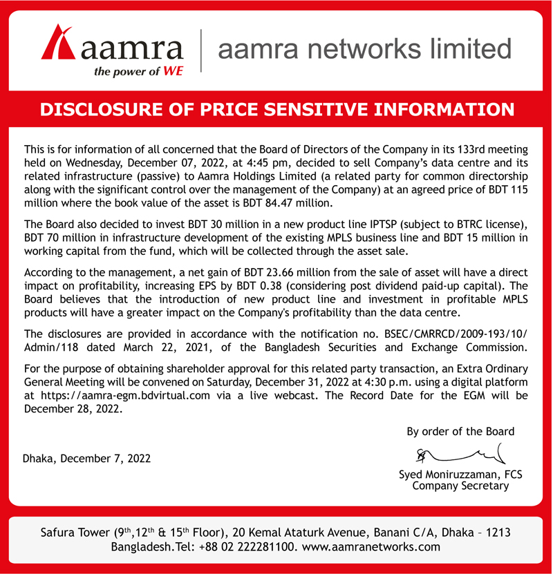 Disclosure of Price Sensitive Information of aamra networks limited