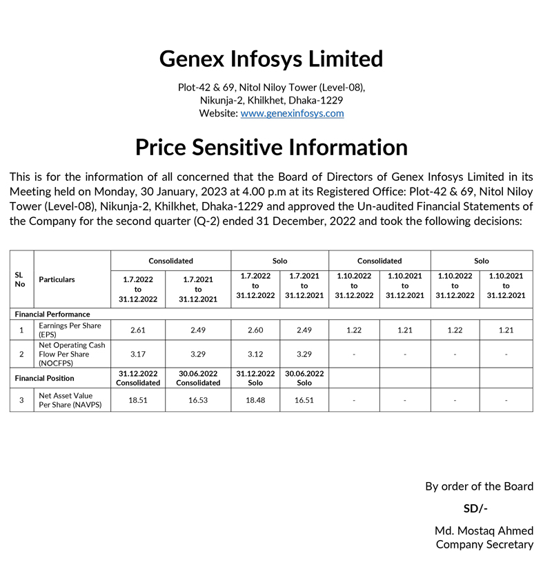 Price Sensitive Inforation of Genex Infosys Limited