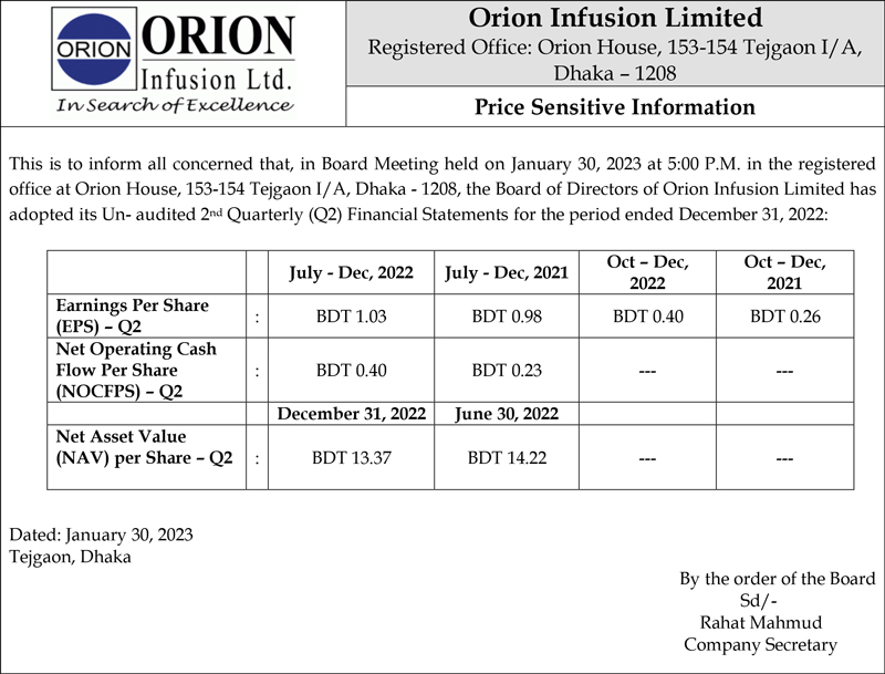Price Sensitive Information of Orion Infusion Ltd.