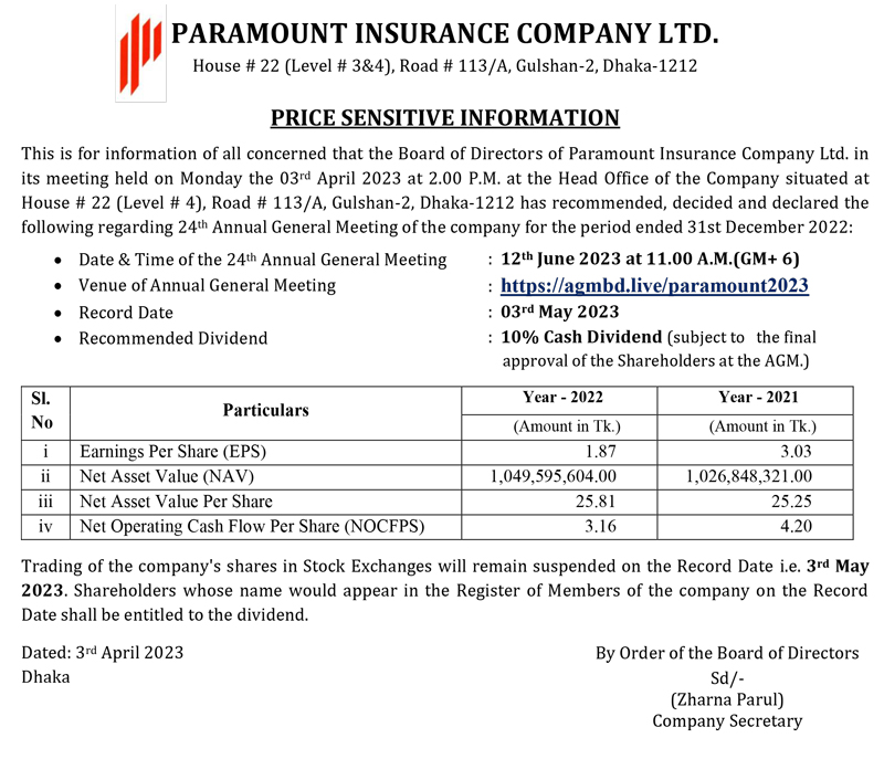 Price Sensitive Information of Paramount Insurance Company Ltd.