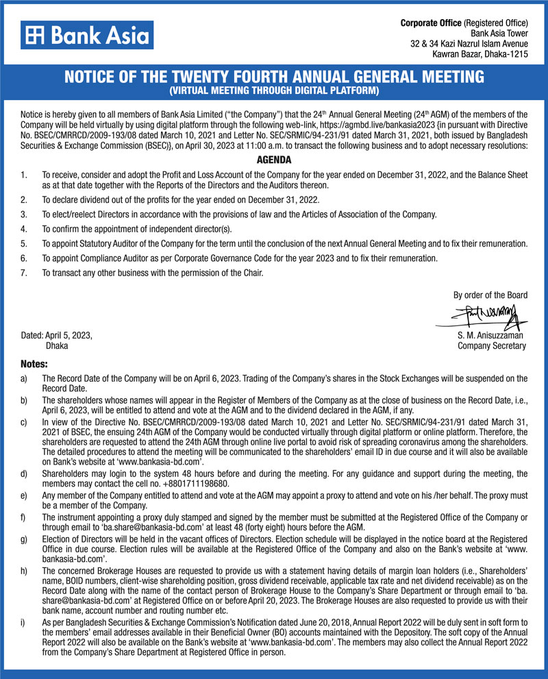 Notice of the 24th AGM of Bank Asia