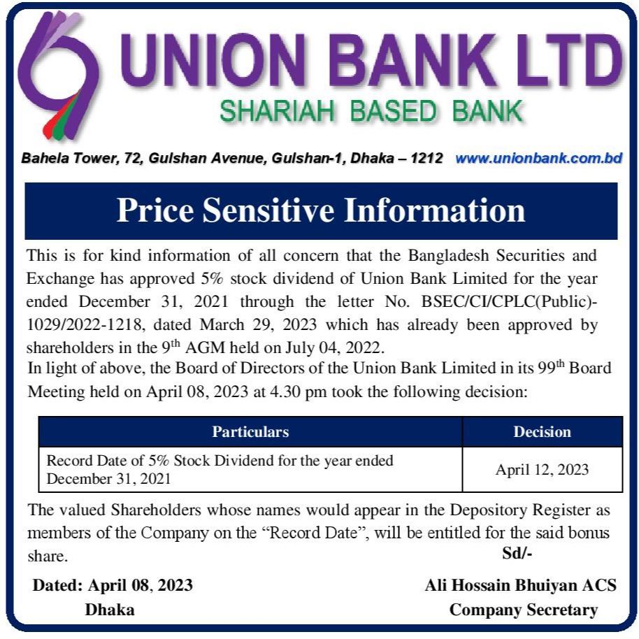 Price Sensitive Information of Union Bank Limited