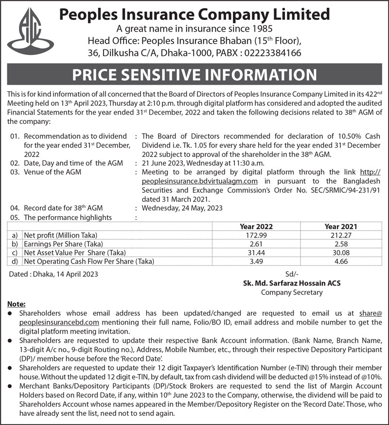 Price Sensitive Information of Peoples Insurance Company Limited