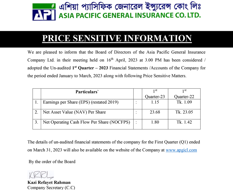 Price Sensitive Information of Asia Pacific General Insurance Company Limited