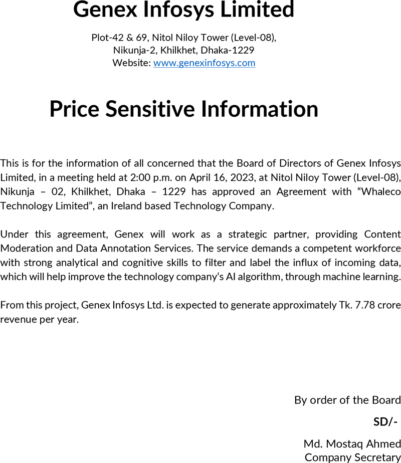 Price Sensitive Information of Genex Infosye Limited