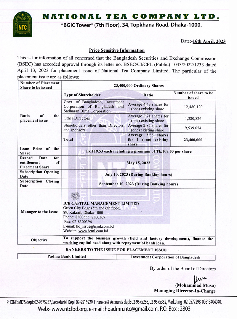 Price Senstive Information of National Tea Company Ltd.