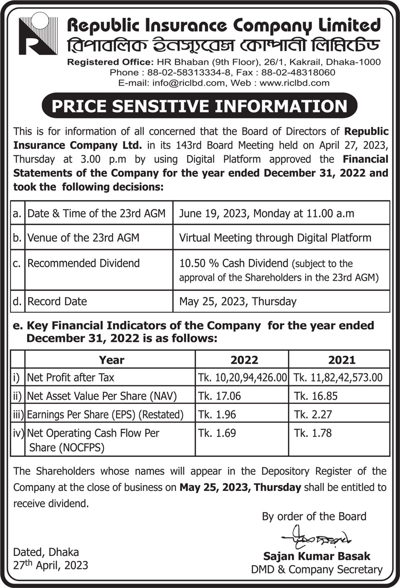 Price Sensitive Information of Republic Insurance Company Ltd.