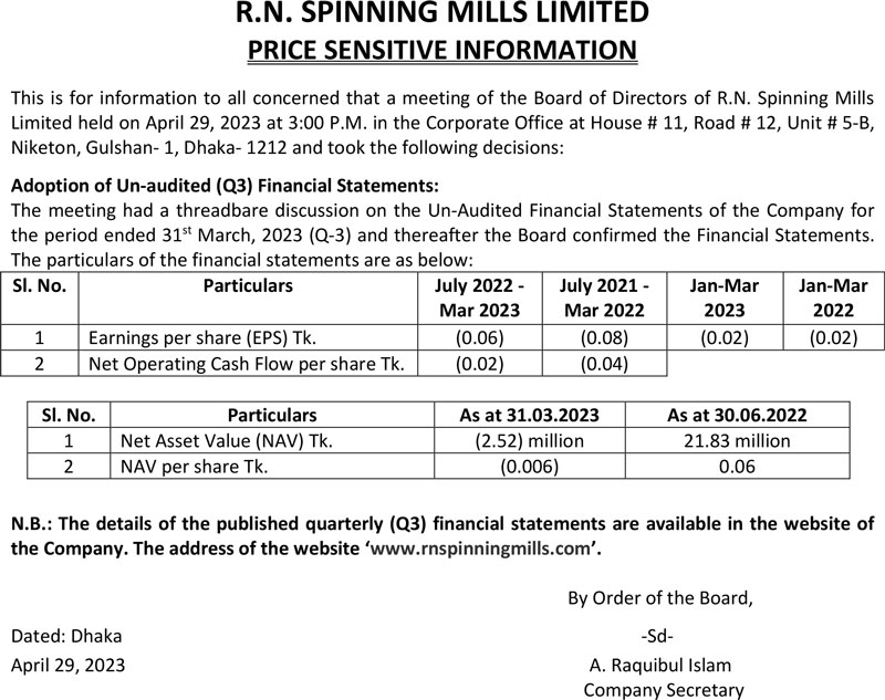 Price Sensitive Information of R.N. Spinning Mills Limited