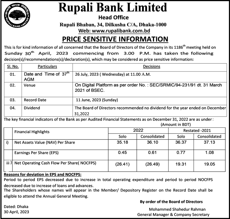 Price Sensitive Information of Rupali Bank Limited