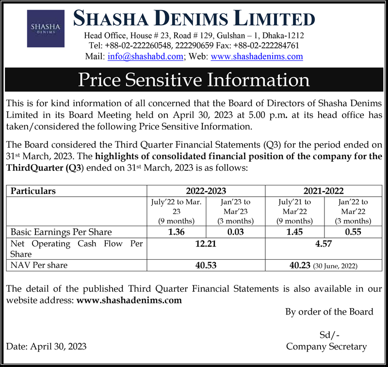 Price Sensitive Information of Shasha Denims Limited