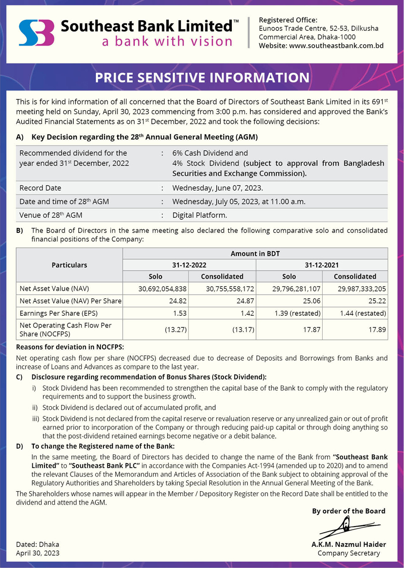 Price Sensitive Information of Southeast Bank Limited