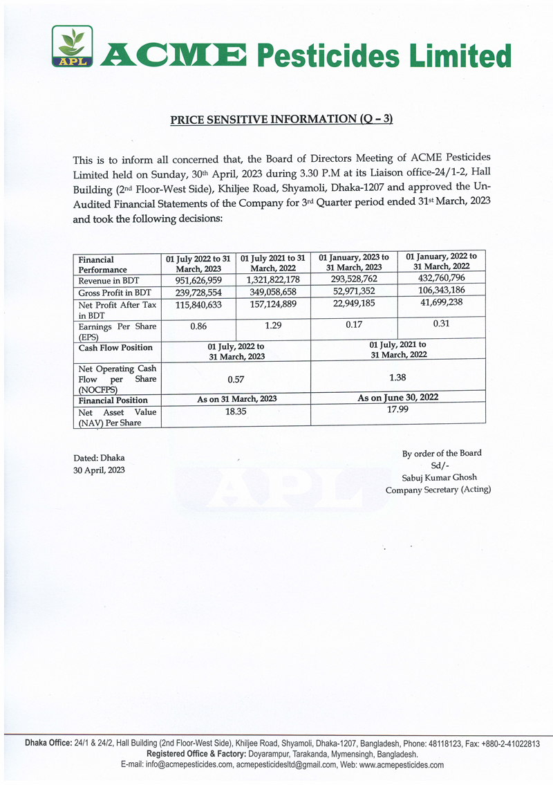 Price Sensitive Information (Q3) of Acme Pesticides Limited