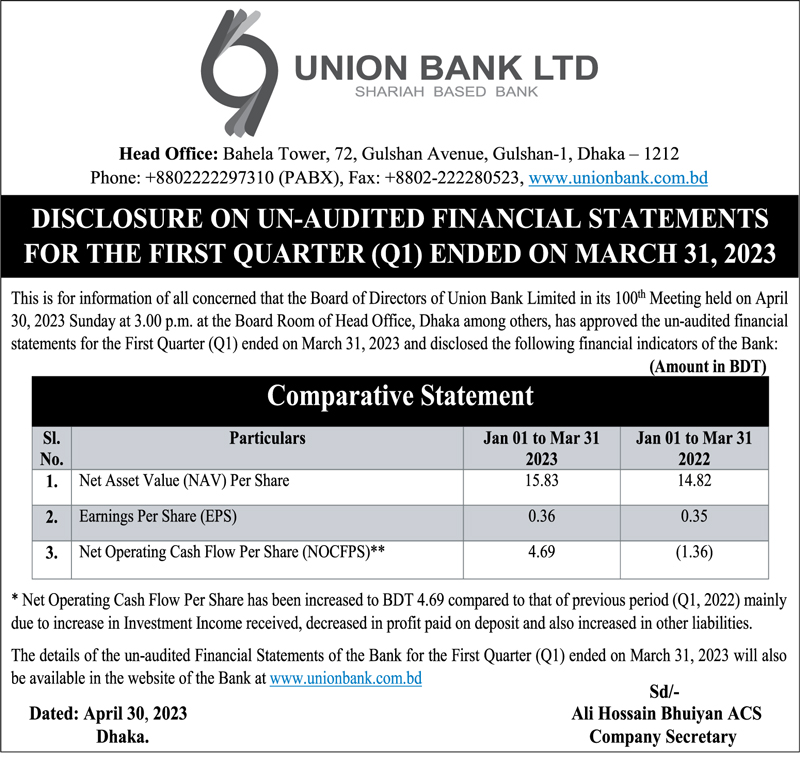 Q1 Financial Statements (Un-audited) of Union Bank Limited
